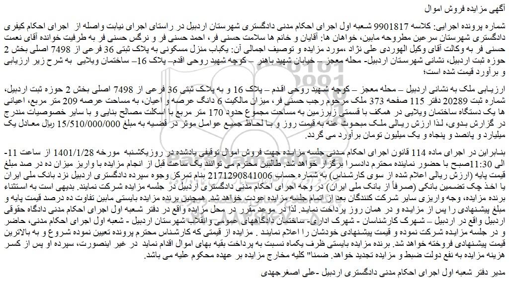 شماره پرونده اجرایی: کلاسه 9901817 شعبه اول اجرای احکام مدنی دادگستری شهرستان اردبیل در راستای اجرای نیابت واصله از اجرای احکام کیفری دادگستری شهرستان سرعین مطروحه مابین، خواهان ها: آقایان و خانم ها سلامت حسنی فر، احمد حسنی فر و نرگس حسنی فر به طرفیت خوانده آقای نعمت حسنی فر به وکالت آقای وکیل الهوردی علی نژاد ،مورد مزایده و توصیف اجمالی آن: یکباب منزل مسکونی به پلاک ثبتی 36 فرعی از 7498 اصلی بخش 2 حوزه ثبت اردبیل، نشانی شهرستان اردبیل- محله معجز – خیابان شهید باهنر – کوچه شهید روحی اقدم– پلاک 16– ساختمان ویلایی به شرح زیر ارزیابی و برآورد قیمت شده است؛