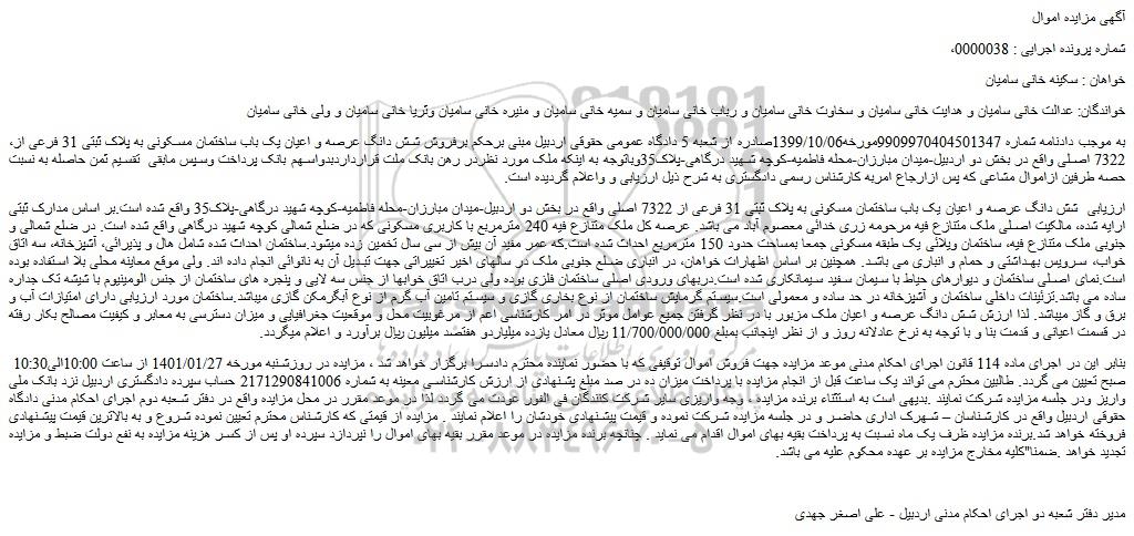 ،به موجب دادنامه شماره 9909970404501347مورخه1399/10/06صادره از شعبه 5 دادگاه عمومی حقوقی اردبیل مبنی برحکم برفروش شش دانگ عرصه و اعیان یک باب ساختمان مسکونی به پلاک ثبتی 31 فرعی از 7322 اصلی واقع در بخش دو اردبیل-میدان مبارزان-محله فاطمیه-کوچه شهید درگاهی-پلاک35وباتوجه به اینکه ملک مورد نظردر رهن بانک ملت قرارداردبدواسهم بانک پرداخت وسپس مابقی تقسیم ثمن حاصله به نسبت حصه طرفین ازاموال مشاعی که پس ازارجاع امربه کارشناس رسمی دادگستری به شرح ذیل ارزیابی و واعلام گردیده است.