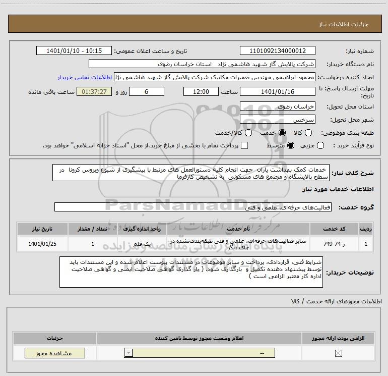 نام دستگاه خریدار:شرکت پالایش گاز شهید هاشمی نژاد استان خراسان رضوی