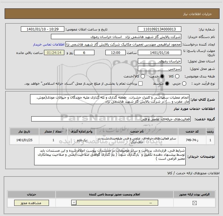 شرح کلی نیاز: انجام عملیات سمپاشی و کنترل حشرات، طعمه گذاری و تله گذاری علیه جوندگان و حیوانات موذی(موش، مار، عقرب و ...) در شرکت پالایش گاز شهید هاشمی نژاد