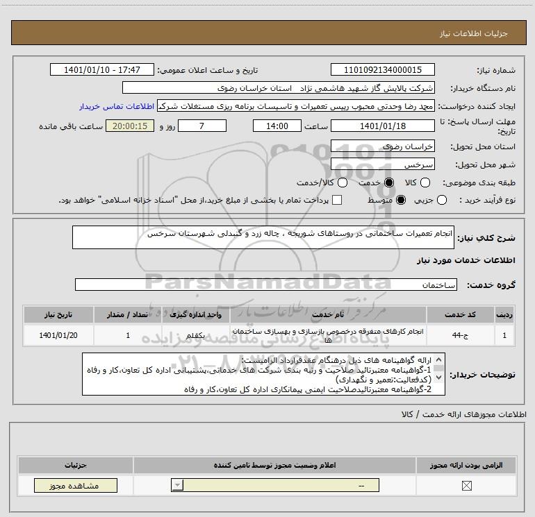 شرح کلی نیاز: انجام تعمیرات ساختمانی در روستاهای شوریجه ، چاله زرد و گنبدلی شهرستان سرخس