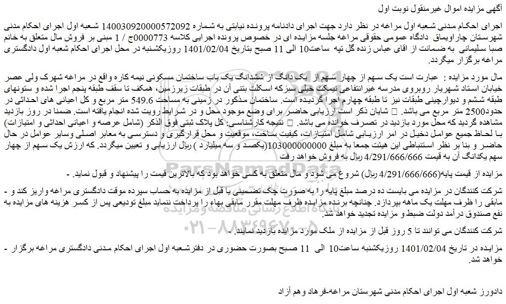 - مزایده در تاریخ 1401/02/04 روزیکشنبه ساعت10 الی 11 صبح بصورت حضوری در دفترشعبه اول اجرای احکام مدنی دادگستری مراغه برگزار خواهد شد.
