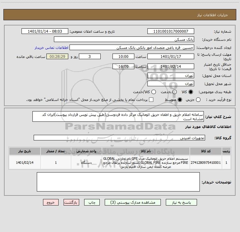 شرح کلی نیاز: سامانه اعلام حریق و اطفاء حریق اتوماتیک مرکز داده فردوسی(طبق پیش نویس قرارداد پیوست)ایران کد مشابه است