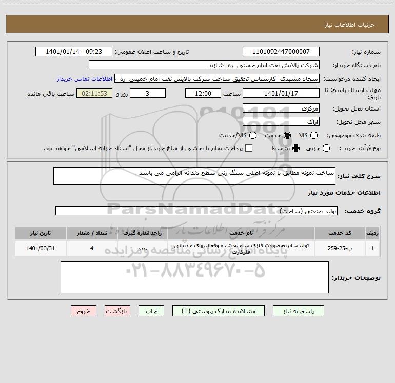 شرح کلی نیاز: ساخت نمونه مطابق با نمونه اصلی-سنگ زنی سطح دندانه الزامی می باشد