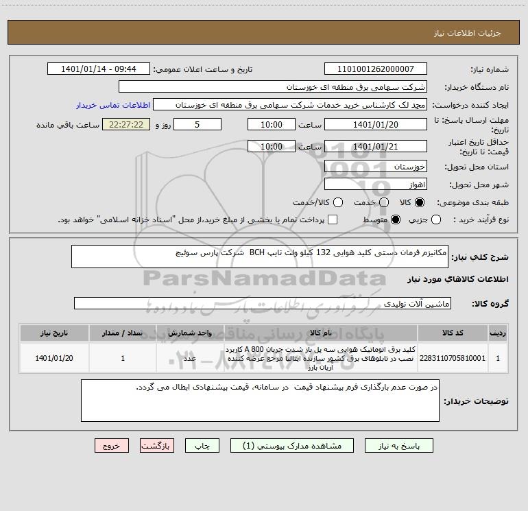شرح کلی نیاز: مکانیزم فرمان دستی کلید هوایی 132 کیلو ولت تایپ BCH شرکت پارس سوئیچ
