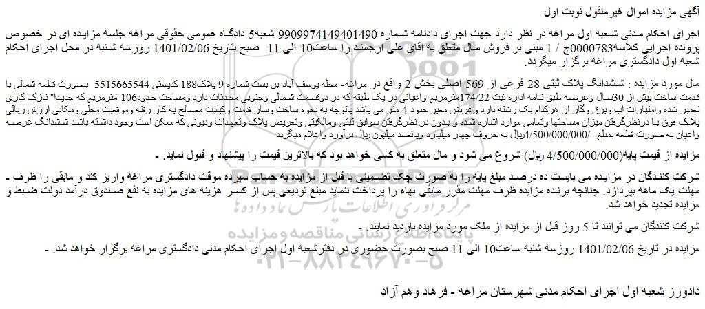 - مزایده در تاریخ 1401/02/06 روزسه شنبه ساعت10 الی 11 صبح بصورت حضوری در دفترشعبه اول اجرای احکام مدنی دادگستری مراغه برگزار خواهد شد.