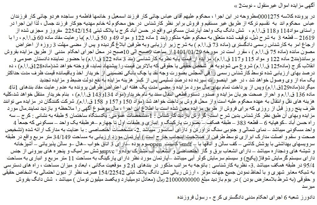 در پرونده کلاسه 0001275مطروحه در این اجرا ، محکوم علیهم آقای عباس چائی کار فرزند اسمعیل و خانمها فاطمه و ساجده هردو چائی کار فرزندان عباس  محکوم اند  به  تقسیم ترکه از طریق غیر مستقیم و فروش برابر نظر کارشناس  در حق محکوم له خانم مهدیه جوکار فرزند جمال ، لذا این اجرا در راستای مواد114 و118 ق.ا.ا.م ،   شش دانگ یک واحد آپارتمان مسکونی واقع در حسن آباد کرج با پلاک ثبتی 22542/154  مفروز و مجزی شده از 21619 – قطعه 3  به شرح ذیل، توقیف شده متعلق به محکوم علیه مذکور(بند 1 ماده 122 و مواد 49 و 50 ق.ا.ا.م )با رعایت مفاد ماده 60 ق.ا.ا.م ، را با ارجاع امر به کارشناس رسمی دادگستری (ماده 73 ق.ا.ا.م ) به شرح زیر ارزیابی وبه طرفین ابلاغ گردیده و پس از مضی مهلت 3 روزه از اعتراض مصون مانده (ماده 75 ق.ا.ا.م ) ، مقرر است در مورخه 1401/01/29 از ساعت 9صبح الی 10صبح در محل اجرای احکام  مدنی  از طریق مزایده بفروش برساند(بند2 ماده 122 و مواد 115 و117 ق.ا.ا.م)، مزایده از قیمت پایه نظریه کارشناسی (بند 3 ماده 122 ق.ا.ا.م) با حضور نماینده دادستان عمومی و انقلاب کرج (ماده125 ق.ا.ا.م) شروع می شودوبه هر شخص حقیقی یا حقوقی که بالاترین قیمت را پیشنهاد نماید، فروخته خواهد شد(ماده128ق.ا.ا.م) ، ده درصد بهای ارزیابی شده توسط کارشناس رسمی را فی المجلس بصورت وجه نقد یا چک بانکی تضمینی از خریدار اخذ وباقیمانده قیمت ظرف مدت حداکثر یک ماه از وی وصول خواهد شد ، در غیر اینصورت سپرده ده درصد تسلیمی پس از کسر هزینه مزایده به نفع دولت ضبط و مزایده تجدید میگردد(ماده129ق.ا.ا.م) وپس از پرداخت تمام بهای مال مورد مزایده و مضی مدت یک هفته ای اعتراض طرفین پرونده به عدم رعایت مفاد بندهای 1تا4 ماده 136 ق.ا.ا.م و احراز صحت جریان مزایده و صدور دستورقطعی انتقال سند به نام خریدار(مواد 134و143 ق.ا.ا.م) ،  بنام خریدار منتقل خواهد شد،کلیه هزینه های نقل وانتقال به عهده محکوم علیه است واز محل فروش پرداخت خواهد شد (مواد 150 و157 و 158 ق.ا.ا.م). شرکت کنندگان در مزایده می توانند ظرف پنج روز قبل از روزی که برای فروش از طریق مزایده معین شده است با اطلاع این اجرا ، مال موضوع آگهی را ملاحظه و بازدید نمایند.مال مورد مزایده وبهای آن طبق نظر کارشناس بدین شرح است: گزارش بازدید کارشناس : 1-مشخصات عمومی: یکدستگاه ساختمان 5 طبقه به نشانی : کرج – سه راه حسن آباد –کوهپایه 6 – قطعه 383 – طبقه همکف – بصورت پارکینگ و انباری و طبقات اول تا چهارم –هرطبقه یک واحد – مسکونی که جمعاً 4 واحد مسکونی میباشد – نمای شمالی و جنوبی سنگ تراورتن و دارای آسانسور میباشد .2- مشخصات اختصاصی : با عنایت به مدارک ارائه شده (تشخیص صحت و سقم و اصلت مدارک ابرازی توسط طرفین از صلاحیت اینجانب خارج است ) آپارتمان مورد ارزیابی به مساحت 34/149 متر مربع واقع در طبقه سوم بوده –دارای 3 اتاق خواب –هال –و سالن پذیریائی – آشپزخانه open با کابینت mdf – سرویسهای بهداشتی با پوشش کاشی – کف سالن و اتاقها با پوشش سرامیک و پنجره های بیرونی از جنس  upvc  و شیشه های ودجداره میباشد – دارای انشعاب برق و گاز اختصاصی و انشعاب آب مشترک بوده و دارای سیستم گرمایش شوفاژ(پکیج) و سیستم سرمایش کولر آبی میباشد –آپارتمان مورد نظر دارای پارکینگ به مساحت 11 متر مربع و انباری به مساحت 95/4 در طبقه همکف میباشد .3- نظریه کارشناسی : باتوجه به مراتب مذکور در بندهای 1و2 و موقعیت مکانی ، ابعاد و میزان مساحت ، راه های دسترسی به شبکه معابر شهری و با لحاظ نمودن جمیع جهات موثر ، ارزش ریالی شش دانگ پلاک ثبتی 154/22542 صرف نظر از دیون احتمالی به اشخاص حقیقی و حقوقی (به شرط بلامعارض بودن ) در یوم بازدید مبلغ 21000000000 ریال (معادل دومیلیارد ویکصد میلیون تومان ) میباشد ،  شش دانگ بفروش میرسد