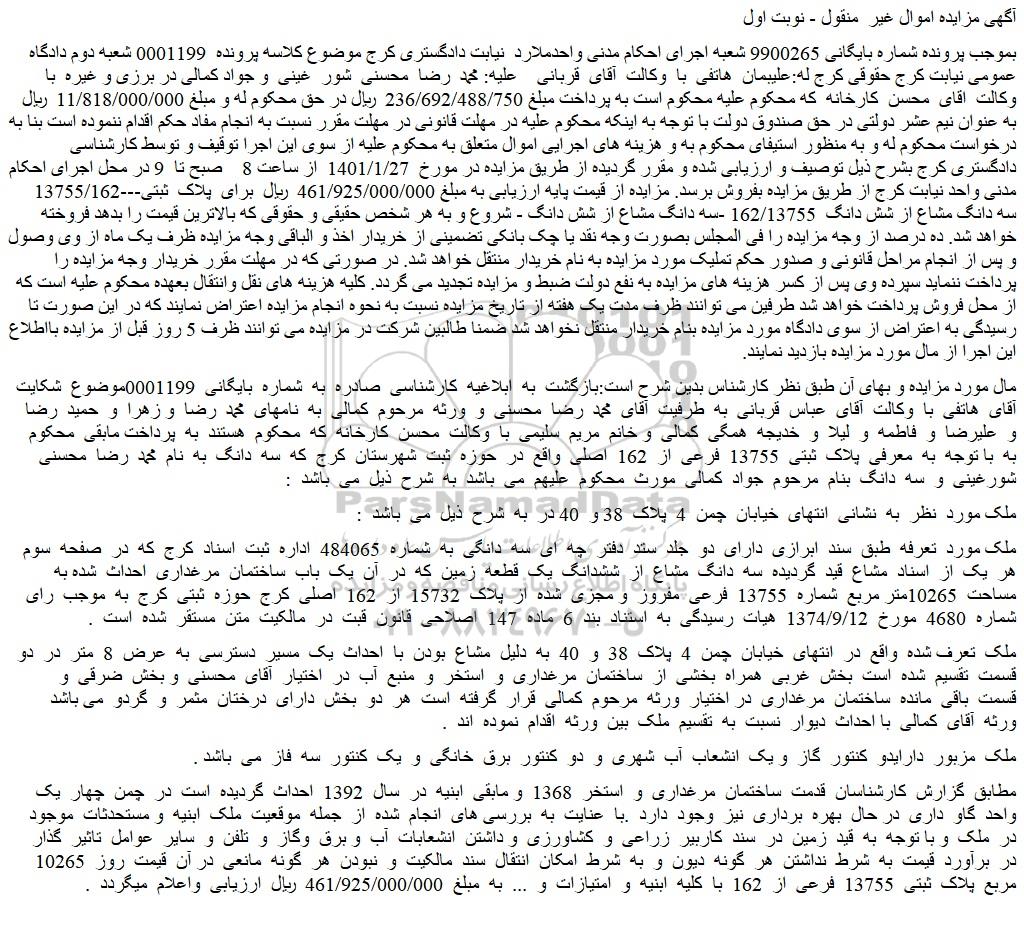 مال مورد مزایده و بهای آن طبق نظر کارشناس بدین شرح است:بازگشت به ابلاغیه کارشناسی صادره به شماره بایگانی 0001199موضوع شکایت آقای هاتفی با وکالت آقای عباس قربانی به طرفیت آقای محمد رضا محسنی و ورثه مرحوم کمالی به نامهای محمد رضا و زهرا و حمید رضا و علیرضا و فاطمه و لیلا و خدیجه همگی کمالی و خانم مریم سلیمی با وکالت محسن کارخانه که محکوم هستند به پرداخت مابقی محکوم به با توجه به معرفی پلاک ثبتی 13755 فرعی از 162 اصلی واقع در حوزه ثبت شهرستان کرج که سه دانگ به نام محمد رضا محسنی شورغینی و سه دانگ بنام مرحوم جواد کمالی مورث محکوم علیهم می باشد به شرح ذیل می باشد :