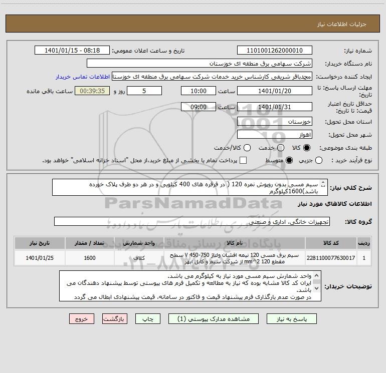 شرح کلی نیاز: سیم مسی بدون روپوش نمره 120 ( در قرقره های 400 کیلویی و در هر دو طرف پلاک خورده باشد)1600کیلوگرم
