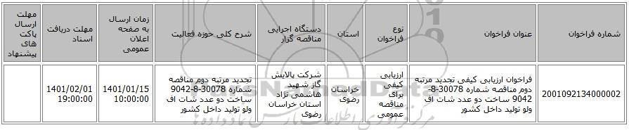 | 2001092134000002 | فراخوان ارزیابی کیفی تجدید مرتبه دوم مناقصه شماره 30078-8-9042 ساخت دو عدد شات اف ولو تولید داخل کشور | ارزیابی کیفی برای مناقصه عمومی | خراسان رضوی | شرکت پالایش گاز شهید هاشمی نژاد استان خراسان رضوی | تجدید مرتبه دوم مناقصه شماره 30078-8-9042 ساخت دو عدد شات اف ولو تولید داخل کشور | 1401/01/15 10:00:00 | 1401/02/01 19:00:00 |