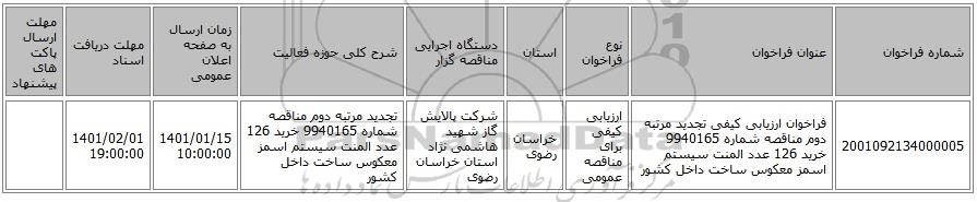 | 2001092134000005 | فراخوان ارزیابی کیفی تجدید مرتبه دوم مناقصه شماره 9940165 خرید 126 عدد المنت سیستم اسمز معکوس ساخت داخل کشور | ارزیابی کیفی برای مناقصه عمومی | خراسان رضوی | شرکت پالایش گاز شهید هاشمی نژاد استان خراسان رضوی | تجدید مرتبه دوم مناقصه شماره 9940165 خرید 126 عدد المنت سیستم اسمز معکوس ساخت داخل کشور | 1401/01/15 10:00:00 | 1401/02/01 19:00:00 |