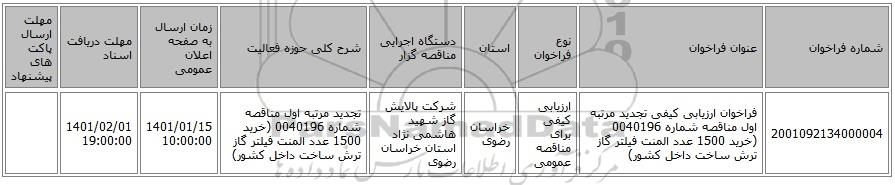 مناقصه، فراخوان ارزیابی کیفی تجدید مرتبه اول مناقصه شماره 0040196 (خرید 1500 عدد المنت فیلتر گاز ترش ساخت داخل کشور), فراخوان ارزیابی کیفی تجدید مرتبه اول مناقصه شماره 0040196 (خرید 1500 عدد المنت فیلتر گاز ترش ساخت داخل کشور)