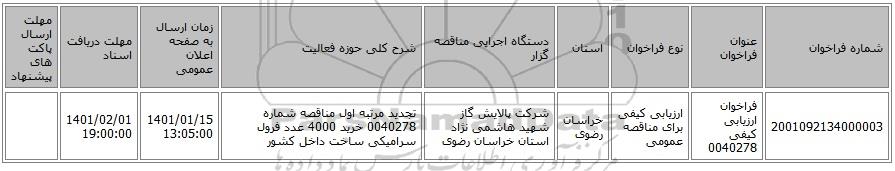 | 2001092134000003 | فراخوان ارزیابی کیفی 0040278 | ارزیابی کیفی برای مناقصه عمومی | خراسان رضوی | شرکت پالایش گاز شهید هاشمی نژاد استان خراسان رضوی | تجدید مرتبه اول مناقصه شماره 0040278 خرید 4000 عدد فرول سرامیکی ساخت داخل کشور | 1401/01/15 13:05:00 | 1401/02/01 19:00:00 |