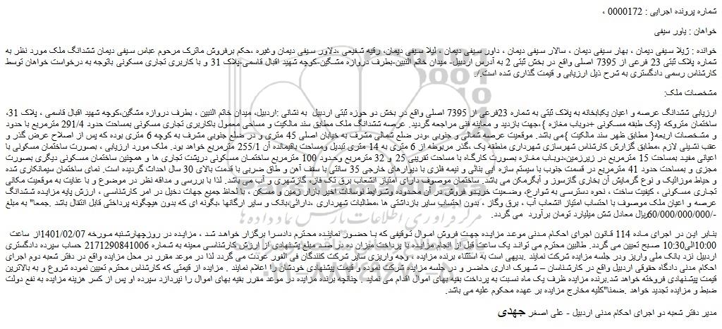 خوانده : ژیلا سیفی دیمان ، بهار سیفی دیمان ، سالار سیفی دیمان ، داور سیفی دیمان ، لیلا سیفی دیمان، رقیه شفیعی ،دلاور سیفی دیمان وغیره ،حکم برفروش ماترک مرحوم عباس سیفی دیمان ششدانگ ملک مورد نظر به شماره پلاک ثبتی 23 فرعی از 7395 اصلی واقع در بخش ثبتی 2 به آدرس اردبیل- میدان خاتم النبین-بطرف دروازه مشگین-کوچه شهید اقبال قاسمی-پلاک 31 و با کاربری تجاری مسکونی باتوجه به درخواست خواهان توسط کارشناس رسمی دادگستری به شرح ذیل ارزیابی و قیمت گذاری شده است./.