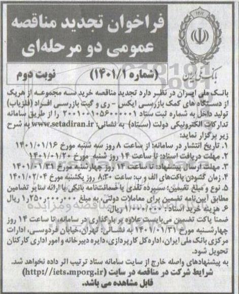 بانک ملی ایران در نظر دارد تجدید مناقصه خرید سه مجموعه از هر یک از دستگاه های کمک بازرسی ایکس - ری و گیت بازرسی افراد (آشکار ساز فلز) تولید داخل به شماره ثبت 2001001056000001 را از طریق سامانه تدارکات الکترونیکی دولت ستاد به نشانی ستاد ایران به شرح زیر برگزار نماید: