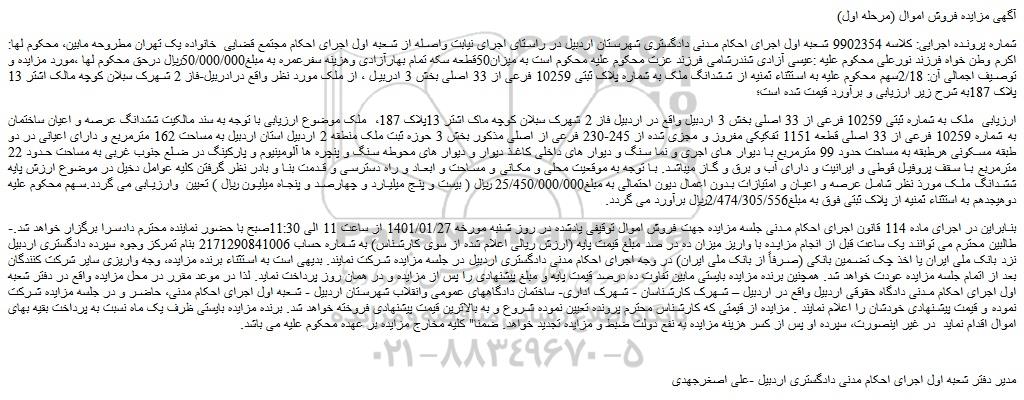 شماره پرونده اجرایی: کلاسه 9902354 شعبه اول اجرای احکام مدنی دادگستری شهرستان اردبیل در راستای اجرای نیابت واصله از شعبه اول اجرای احکام مجتمع قضایی خانواده یک تهران مطروحه مابین، محکوم لها: اکرم وطن خواه فرزند نورعلی محکوم علیه :عیسی آزادی شندرشامی فرزند عزت محکوم علیه محکوم است به میزان50قطعه سکه تمام بهارآزادی وهزینه سفرعمره به مبلغ50/000/000ریال درحق محکوم لها ،مورد مزایده و توصیف اجمالی آن: 2/18سهم محکوم علیه به استثناء ثمنیه از ششدانگ ملک به شماره پلاک ثبتی 10259 فرعی از 33 اصلی بخش 3 ادربیل ، از ملک مورد نظر واقع درادربیل-فاز 2 شهرک سبلان کوچه مالک اشتر 13 پلاک 187به شرح زیر ارزیابی و برآورد قیمت شده است؛
