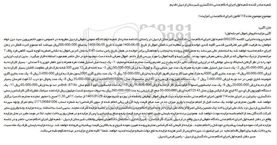 شعبه صادر کننده:شعبه اول اجرای احکام مدنی دادگستری شهرستان اردبیل/قدیم