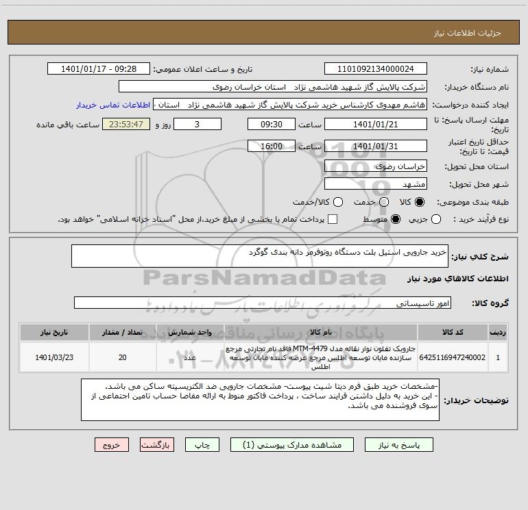 نام دستگاه خریدار:شرکت پالایش گاز شهید هاشمی نژاد استان خراسان رضوی