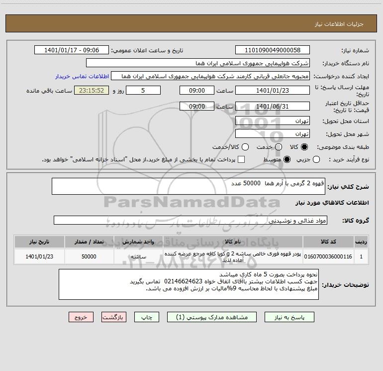 شرح کلی نیاز: قهوه 2 گرمی با آرم هما 50000 عدد