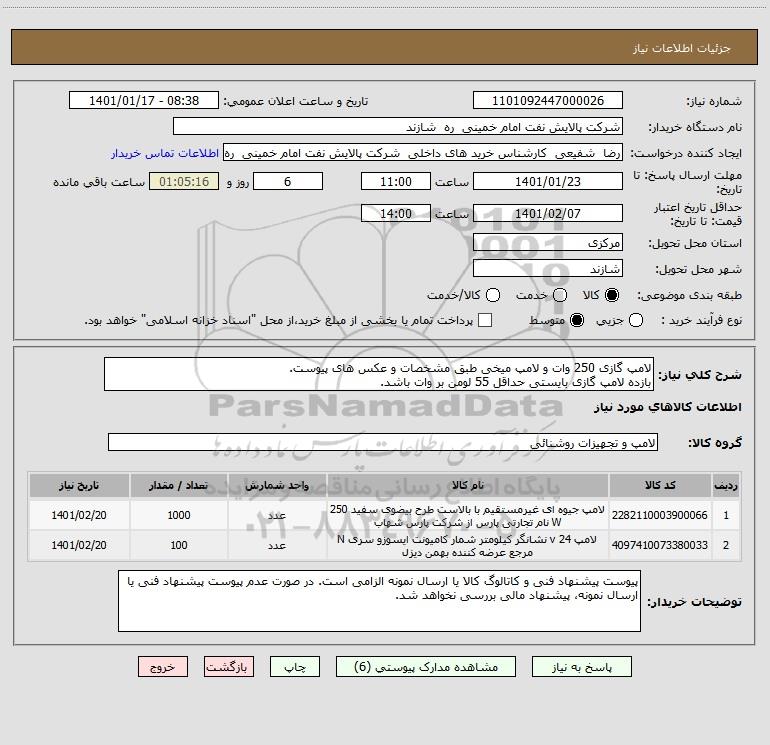 شرح کلی نیاز: لامپ گازی 250 وات و لامپ میخی طبق مشخصات و عکس های پیوست.