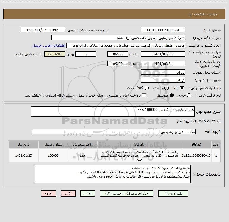 شرح کلی نیاز: عسل تکنفره 20 گرمی 100000 عدد