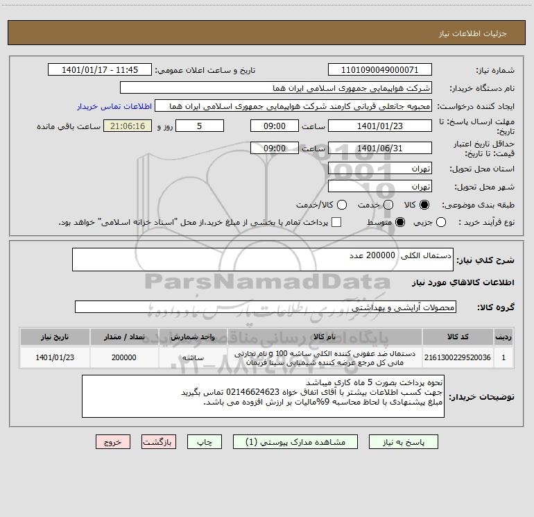 شرح کلی نیاز: دستمال الکلی 200000 عدد