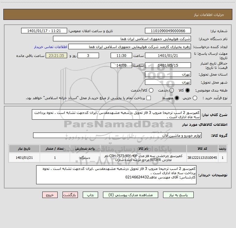 شرح کلی نیاز: کمپرسور 2 اسب ترجیحا منروپ 3 فاز تحویل درشعبه مشهدمقدس .ایران کدجهت تشابه است . نحوه پرداخت سه ماه اداری است .