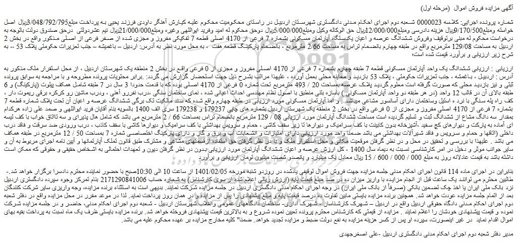 شماره پرونده اجرایی: کلاسه 0000023 شعبه دوم اجرای احکام مدنی دادگستری شهرستان اردبیل در راستای محکومیت محکوم علیه کیارش آهنگر داودی فرزند یحیی به پرداخت مبلغ3/048/792/795ریال اصل خواسته ومبلغ9/170/500ریال هزینه دادرسی ومبلغ12/000/000ریال حق الوکاله وکیل ومبلغ5/000/000ریال دوحق محکوم له امید وفرید ایواللهی وغیره ومبلغ21/000/000ریال نیم عشردولتی  درحق صندوق دولت باتوجه به درخواست محکوم له مبنی برتوقیف وفروش ششدانگ عرصه و اعیان یکدستگاه آپارتمان مسکونی بشماره 7 فرعی از 4170 اصلی قطعه 7 تفکیکی مفروز و مجزی شده از صفر فرعی از اصلی مذکور واقع در بخش 2 اردبیل به مساحت 129/08 مترمربع واقع در طبقه چهارم بانضمام تراس به مساحت 2/66 مترمربع ، بانضمام پارکینگ قطعه هفت  ، به محل مورد نظر به آدرس: اردبیل – باغمیشه – جنب تعزیرات حکومتی پلاک 53 ،، به شرح زیر ارزیابی و برآورد قیمت شده است؛