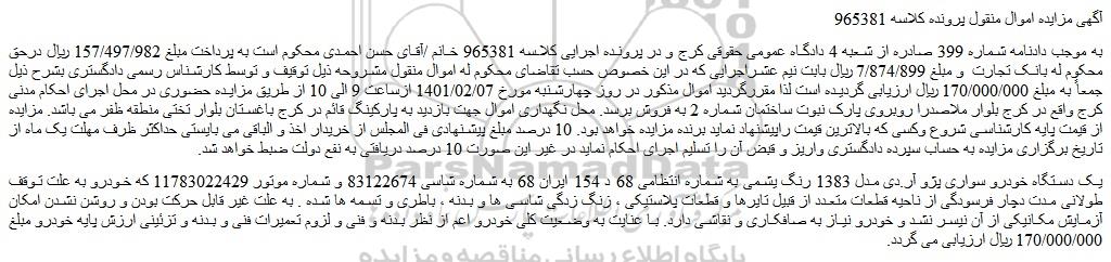به موجب دادنامه شماره 399 صادره از شعبه 4 دادگاه عمومی حقوقی کرج و در پرونده اجرایی کلاسه 965381 خانم /آقای حسن احمدی محکوم است به پرداخت مبلغ 157/497/982 ریال درحق محکوم له بانک تجارت  و مبلغ 7/874/899 ریال بابت نیم عشراجرایی که در این خصوص حسب تقاضای محکوم له اموال منقول مشروحه ذیل توقیف و توسط کارشناس رسمی دادگستری بشرح ذیل جمعاً به مبلغ 170/000/000 ریال ارزیابی گردیده است لذا مقررگردید اموال مذکور در روز چهارشنبه مورخ 1401/02/07 ازساعت 9 الی 10 از طریق مزایده حضوری در محل اجرای احکام مدنی کرج واقع در کرج بلوار ملاصدرا روبروی پارک نبوت ساختمان شماره 2 به فروش برسد. محل نگهداری اموال جهت بازدید به پارکینگ قائم در کرج باغستان بلوار تختی منطقه ظفر می باشد. مزایده از قیمت پایه کارشناسی شروع وکسی که بالاترین قیمت راپیشنهاد نماید برنده مزایده خواهد بود. 10 درصد مبلغ پیشنهادی فی المجلس از خریدار اخذ و الباقی می بایستی حداکثر ظرف مهلت یک ماه از تاریخ برگزاری مزایده به حساب سپرده دادگستری واریز و قبض آن را تسلیم اجرای احکام نماید در غیر این صورت 10 درصد دریافتی به نفع دولت ضبط خواهد شد.
