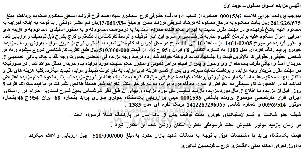بموجب پرونده اجرایی کلاسه  0001536  صادره از شعبه 14 دادگاه حقوقی کرج  محکوم علیه احمد فرخ فرزند اسحق محکوم است به پرداخت  مبلغ 261/226/675 ریال بابت محکوم به درحق محکوم له فرهاد شریفی فرزند حسن  و مبلغ 13/061/334ریال نیم عشر دولتی . با توجه به اینکه اجراییه به محکوم علیه ابلاغ گردیده و در مهلت مقرر نسبت به اجرای حکم اقدام ننموده است بنا به درخواست محکوم له و به منظور استیفای  محکوم به و هزینه های اجرایی  اموال محکوم علیه برابرمتن اگهی و نظریه کارشناسی از سوی این اجرا توقیف و توسط کارشناس دادگستری کرج بشرح ذیل توصیف و ارزیابی شده و مقرر گردیده در مورخ 1401/02/05  از ساعت 10 الی  11 صبح در محل اجرای احکام مدنی شعبه دادگستری کرج از طریق مزایده بفروش برسد. مزایده  خودرو پراید رنگ نقره ای مدل 1383 به شماره انتظامی 68 ایران 954 ج 46  از قیمت 510/000/000 ریال طبق نظریه کارشناسی شروع میشود و به هر شخص  حقیقی و حقوقی که بالاترین قیمت را پیشنهاد نماید فروخته خواهد شد . ده درصد وجه مزایده فی المجلس بصورت وجه نقد یا چک بانکی  تضمینی از خریدار اخذ و الباقی ظرف یک ماه از وی وصول و پس از انجام مراحل قانونی و صدور حکم تملیک مورد مزایده بنام خریدار منتقل خواهد شد . در صورتیکه در مهلت مقرر خریدار وجه مزایده راپرداخت ننماید سپرده وی پس از کسر هزینه های مزایده به نفع دولت ضبط و مزایده تجدید میگردد.کلیه هزینه های نقل و انتقال بعهده محکوم علیه است.که از محل فروش پرداخت خواهد شد.طرفین میتوانند ظرف مدت یک هفته از تاریخ مزایده نسبت به نحوه انجام مزایده اعتراض نمایند که در اینصورت تا رسیدگی به اعتراض از سوی دادگاه مورد مزایده به نام خریدار منتقل نخواهد شد. ضمناً طا لبین بشرکت در مزایده میتوانند ظرف 5 روز  قبل از مزایده با اطلاع از مال مورد مزایده بازدید نمایند. مال مورد مزایده و بهای آن طبق نظر کارشناس بدین شرح است:با  احترام  در  راستای  اجرای  قرار  کارشناسی  موضوع  پرونده  بایگانی  0001536  مبنی  بر ارزیابی  یکدستگاه  خودرو  سواری  پراید  بشماره  68  ایران  954 ج 46 بشماره موتور  00969514 و  شماره  شاسی  1412283296065  برنگ  نقره  ای  مدل  1383  .