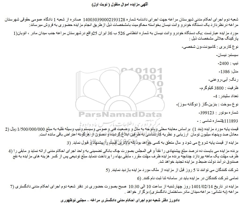 شعبه دوم اجرای احکام مدنی شهرستان مراغه جهت اجرای دادنامه شماره 140030390002193128 صادره از شعبه 1 دادگاه عمومی حقوقی شهرستان مراغه درنظردارد یک دستگاه خودرو وانت نیسان بخواسته محکومیت بامشخصات ذیل ازطریق انجام مزایده حضوری به فروش میرساند: