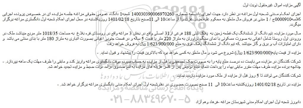 اجرای احکام مدنی شعبه اول مراغه در نظر دارد جهت اجرای دادنامه شماره  140030390006970260 شعبه1 دادگاه عمومی حقوقی مراغه جلسه مزایده ای در خصوص پرونده اجرایی کلاسه0000910ج / 1 مبنی بر فروش مال متعلق به محکوم علیه حیدر عزت را از ساعت10 الی 11صبح بتاریخ 1401/02/18 روزیکشنبه در محل اجرای احکام شعبه اول دادگستری مراغه برگزار میگردد.