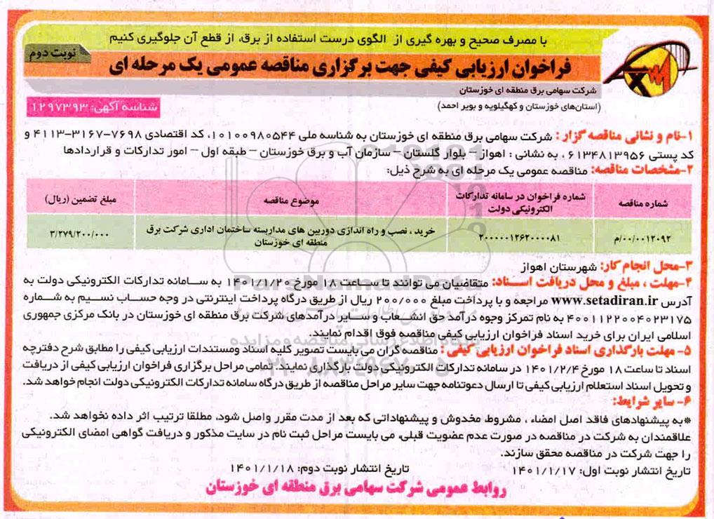 نام و نشانی مناقصه گزار: شرکت سهامی برق منطقه ای خوزستان به شناسه ملی