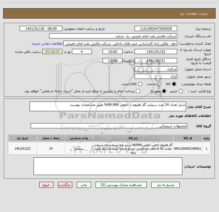شرح کلی نیاز: شارژ تعداد 24 عدد سیلندر گاز هلیوم با خلوص 99.999% طبق مشخصات پیوست
