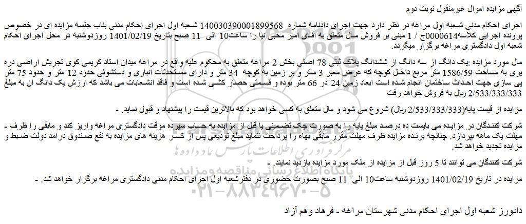 - مزایده در تاریخ 1401/02/19 روزدوشنبه ساعت10 الی 11 صبح بصورت حضوری در دفترشعبه اول اجرای احکام مدنی دادگستری مراغه برگزار خواهد شد.