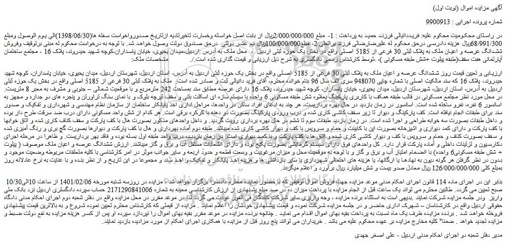 در راستای محکومیت محکوم علیه: فریددانیالی فرزند حمید به پرداخت : 1- مبلغ 2/000/000/000ریال از بابت اصل خواسته وخسارت تاخیرتادیه ازتاریخ صدورواخواست سفته ها(1398/06/30)الی یوم الوصول ومبلغ 68/991/300ریال هزینه دادرسی درحق محکوم له علیرضارضائی فرزند براتعلی 2- مبلغ100/000/000ریال نیم عشر دولتی درحق صندوق دولت وصول خواهد شد. با توجه به درخواست محکوم له مبنی برتوقیف وفروش ششدانگ عرصه و اعیان ملک به پلاک ثبتی 30 فرعی از 5185 اصلی واقع در بخش یک حوزه ثبتی اردبیل ، محل ملک به آدرس :اردبیل،میدان یحیوی، خیابان پاسداران،کوچه شهید حیدروند، پلاک 16 ، مجتمع ساختمان آپارتمانی هفت سقف(طبقه پیلوت +شش طبقه مسکونی )، ،توسط کارشناس رسمی دادگستری به شرح ذیل ارزیابی و قیمت گذاری شده است./. مشخصات ملک: