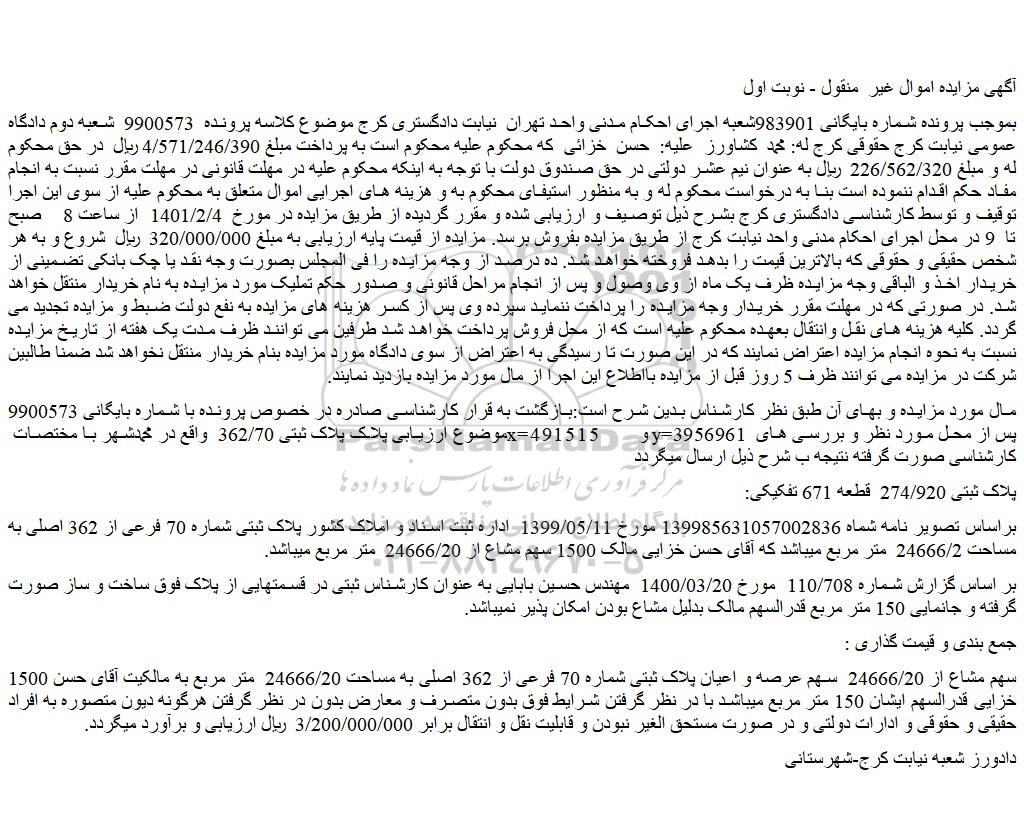 بموجب پرونده شماره بایگانی 983901شعبه اجرای احکام مدنی واحد تهران  نیابت دادگستری کرج موضوع کلاسه پرونده  9900573  شعبه دوم دادگاه عمومی نیابت کرج حقوقی کرج له: محمد  کشاورز  علیه:  حسن  خزائی  که محکوم علیه محکوم است به پرداخت مبلغ 4/571/246/390 ریال  در حق محکوم له و مبلغ 226/562/320  ریال به عنوان نیم عشر دولتی در حق صندوق دولت با توجه به اینکه محکوم علیه در مهلت قانونی در مهلت مقرر نسبت به انجام مفاد حکم اقدام ننموده است بنا به درخواست محکوم له و به منظور استیفای محکوم به و هزینه های اجرایی اموال متعلق به محکوم علیه از سوی این اجرا توقیف و توسط کارشناسی دادگستری کرج بشرح ذیل توصیف و ارزیابی شده و مقرر گردیده از طریق مزایده در مورخ  1401/2/4  از ساعت 8    صبح تا  9 در محل اجرای احکام مدنی واحد نیابت کرج از طریق مزایده بفروش برسد. مزایده از قیمت پایه ارزیابی به مبلغ 320/000/000  ریال  شروع و به هر شخص حقیقی و حقوقی که بالاترین قیمت را بدهد فروخته خواهد شد. ده درصد از وجه مزایده را فی المجلس بصورت وجه نقد یا چک بانکی تضمینی از خریدار اخذ و الباقی وجه مزایده ظرف یک ماه از وی وصول و پس از انجام مراحل قانونی و صدور حکم تملیک مورد مزایده به نام خریدار منتقل خواهد شد. در صورتی که در مهلت مقرر خریدار وجه مزایده را پرداخت ننماید سپرده وی پس از کسر هزینه های مزایده به نفع دولت ضبط و مزایده تجدید می گردد. کلیه هزینه های نقل وانتقال بعهده محکوم علیه است که از محل فروش پرداخت خواهد شد طرفین می توانند ظرف مدت یک هفته از تاریخ مزایده نسبت به نحوه انجام مزایده اعتراض نمایند که در این صورت تا رسیدگی به اعتراض از سوی دادگاه مورد مزایده بنام خریدار منتقل نخواهد شد ضمنا طالبین شرکت در مزایده می توانند ظرف 5 روز قبل از مزایده بااطلاع این اجرا از مال مورد مزایده بازدید نمایند.