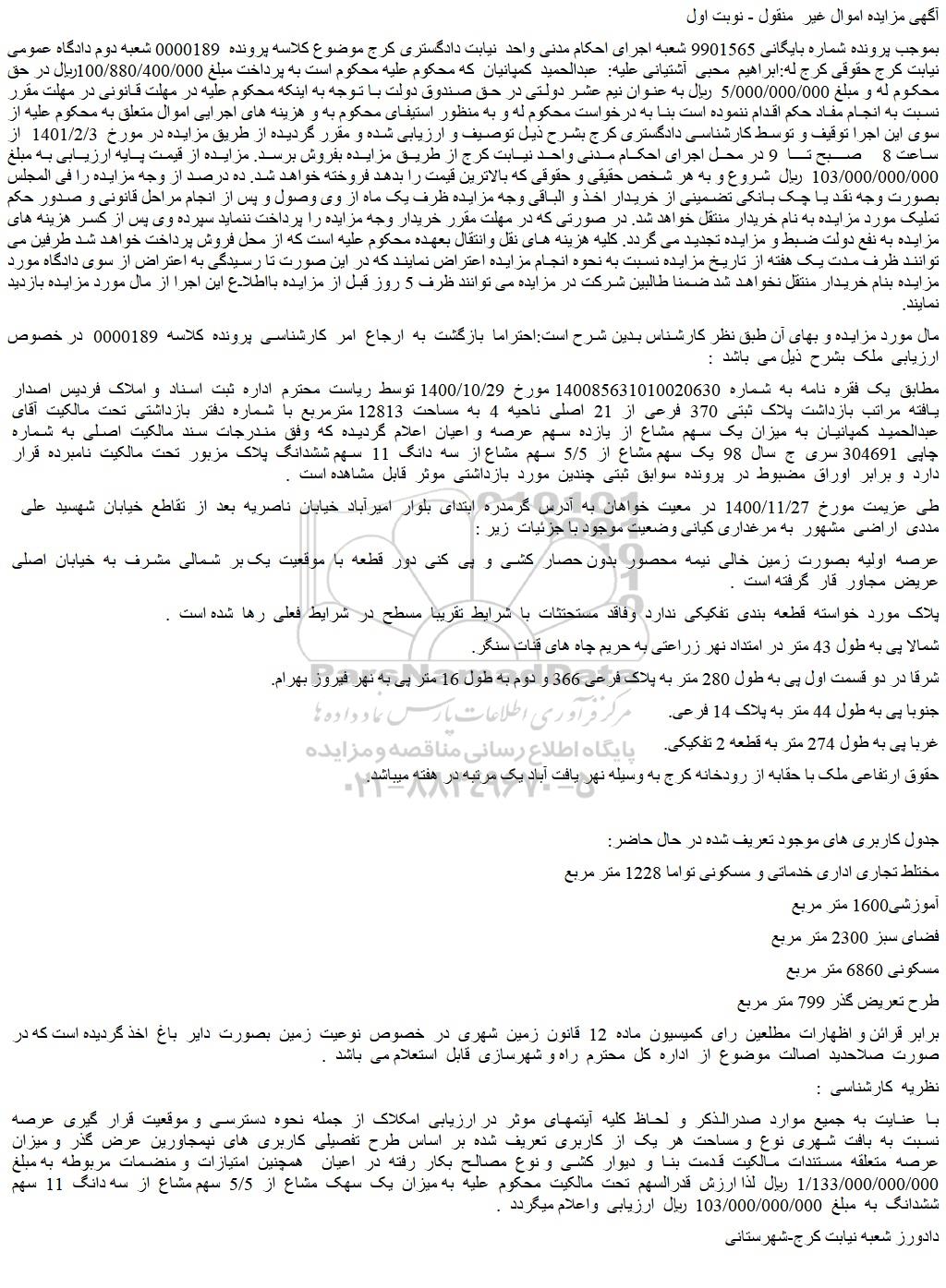 بموجب پرونده شماره بایگانی 9901565 شعبه اجرای احکام مدنی واحد نیابت دادگستری کرج موضوع کلاسه پرونده 0000189 شعبه دوم دادگاه عمومی نیابت کرج حقوقی کرج له:ابراهیم محبی آشتیانی علیه: عبدالحمید کمپانیان که محکوم علیه محکوم است به پرداخت مبلغ 100/880/400/000ریال در حق محکوم له و مبلغ 5/000/000/000 ریال به عنوان نیم عشر دولتی در حق صندوق دولت با توجه به اینکه محکوم علیه در مهلت قانونی در مهلت مقرر نسبت به انجام مفاد حکم اقدام ننموده است بنا به درخواست محکوم له و به منظور استیفای محکوم به و هزینه های اجرایی اموال متعلق به محکوم علیه از سوی این اجرا توقیف و توسط کارشناسی دادگستری کرج بشرح ذیل توصیف و ارزیابی شده و مقرر گردیده از طریق مزایده در مورخ 1401/2/3 از ساعت 8 صبح تا 9 در محل اجرای احکام مدنی واحد نیابت کرج از طریق مزایده بفروش برسد. مزایده از قیمت پایه ارزیابی به مبلغ 103/000/000/000 ریال شروع و به هر شخص حقیقی و حقوقی که بالاترین قیمت را بدهد فروخته خواهد شد. ده درصد از وجه مزایده را فی المجلس بصورت وجه نقد یا چک بانکی تضمینی از خریدار اخذ و الباقی وجه مزایده ظرف یک ماه از وی وصول و پس از انجام مراحل قانونی و صدور حکم تملیک مورد مزایده به نام خریدار منتقل خواهد شد. در صورتی که در مهلت مقرر خریدار وجه مزایده را پرداخت ننماید سپرده وی پس از کسر هزینه های مزایده به نفع دولت ضبط و مزایده تجدید می گردد. کلیه هزینه های نقل وانتقال بعهده محکوم علیه است که از محل فروش پرداخت خواهد شد طرفین می توانند ظرف مدت یک هفته از تاریخ مزایده نسبت به نحوه انجام مزایده اعتراض نمایند که در این صورت تا رسیدگی به اعتراض از سوی دادگاه مورد مزایده بنام خریدار منتقل نخواهد شد ضمنا طالبین شرکت در مزایده می توانند ظرف 5 روز قبل از مزایده بااطلاع این اجرا از مال مورد مزایده بازدید نمایند.