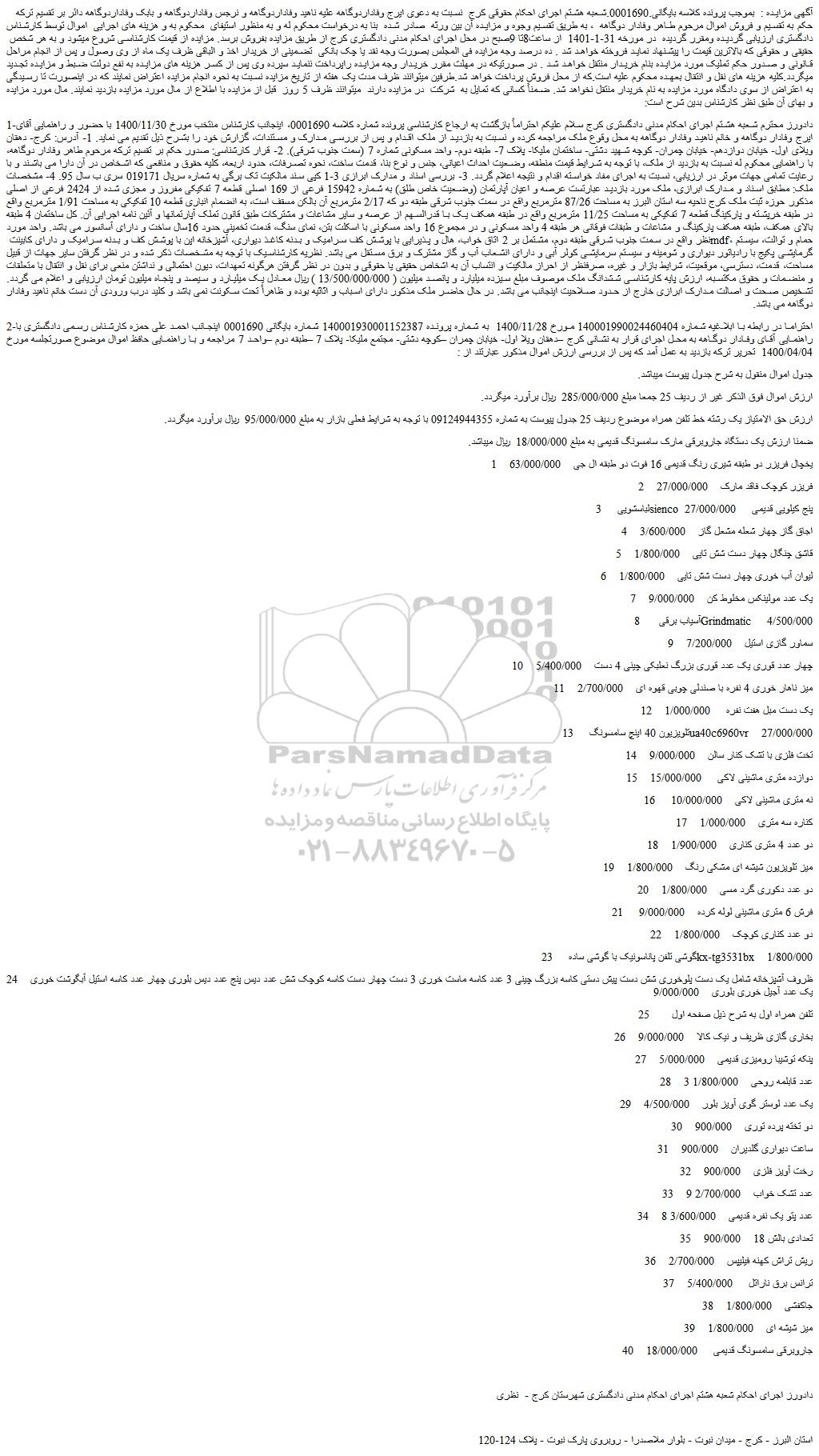 آگهی مزایده : بموجب پرونده کلاسه بایگانی.0001690.شعبه هشتم اجرای احکام حقوقی کرج نسبت به دعوی ایرج وفاداردوگاهه علیه ناهید وفاداردوگاهه و نرجس وفاداردوگاهه و بابک وفاداردوگاهه دائر بر تقسیم ترکه حکم به تقسیم و فروش اموال مرحوم طاهر وفادار دوگاهه ، به طریق تقسیم وجوه و مزایده آن بین ورثه صادر شده بنا به درخواست محکوم له و به منظور استیفای محکوم به و هزینه های اجرایی اموال توسط کارشناس دادگستری ارزیابی گردیده ومقرر گردیده در مورخه 31-1-1401 از ساعت8تا 9صبح در محل اجرای احکام مدنی دادگستری کرج از طریق مزایده بفروش برسد. مزایده از قیمت کارشناسی شروع میشود و به هر شخص حقیقی و حقوقی که بالاترین قیمت را پیشنهاد نماید فروخته خواهد شد . ده درصد وجه مزایده فی المجلس بصورت وجه نقد یا چک بانکی تضمینی از خریدار اخذ و الباقی ظرف یک ماه از وی وصول و پس از انجام مراحل قانونی و صدور حکم تملیک مورد مزایده بنام خریدار منتقل خواهد شد . در صورتیکه در مهلت مقرر خریدار وجه مزایده راپرداخت ننماید سپرده وی پس از کسر هزینه های مزایده به نفع دولت ضبط و مزایده تجدید میگردد.کلیه هزینه های نقل و انتقال بعهده محکوم علیه است.که از محل فروش پرداخت خواهد شد.طرفین میتوانند ظرف مدت یک هفته از تاریخ مزایده نسبت به نحوه انجام مزایده اعتراض نمایند که در اینصورت تا رسیدگی به اعتراض از سوی دادگاه مورد مزایده به نام خریدار منتقل نخواهد شد. ضمناً کسانی که تمایل به شرکت در مزایده دارند میتوانند ظرف 5 روز قبل از مزایده با اطلاع از مال مورد مزایده بازدید نمایند. مال مورد مزایده و بهای آن طبق نظر کارشناس بدین شرح است: