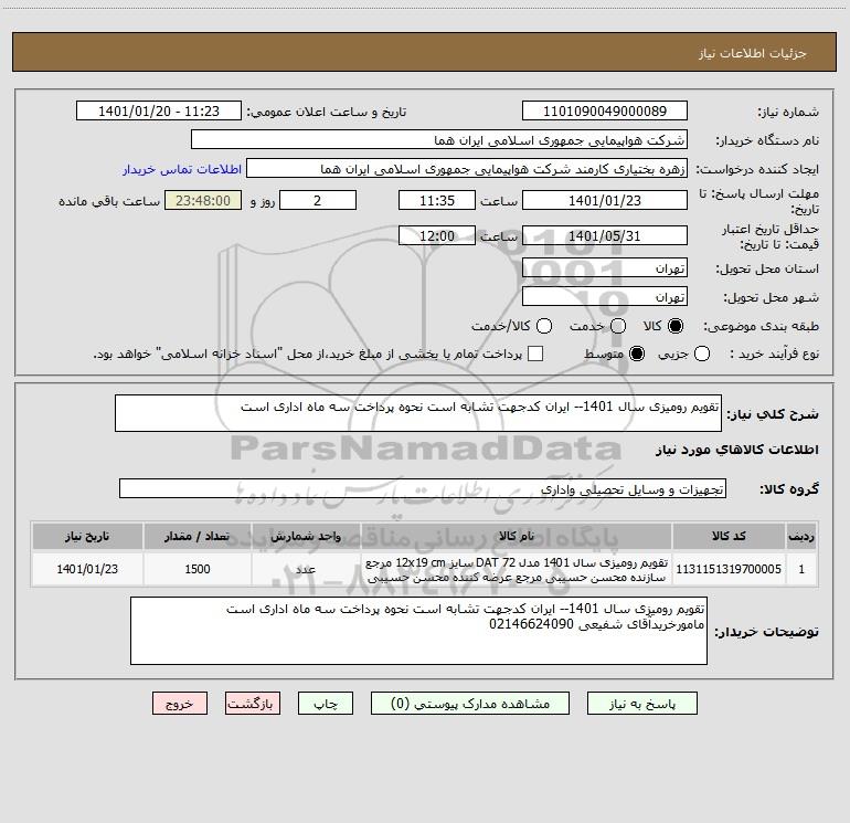 شرح کلی نیاز: تقویم رومیزی سال 1401-- ایران کدجهت تشابه است نحوه پرداخت سه ماه اداری است