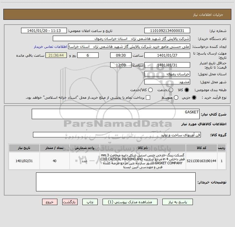 نام دستگاه خریدار:شرکت پالایش گاز شهید هاشمی نژاد استان خراسان رضوی