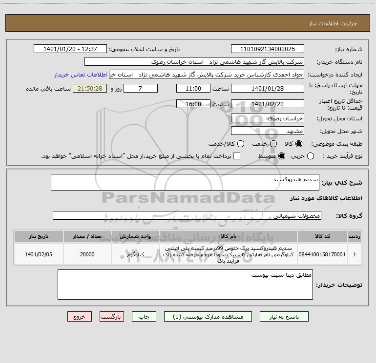 | 1 | 0844100158170001 | سدیم هیدروکسید پرک خلوص 99درصد کیسه پلی اتیلنی کیلوگرمی نام تجارتی کاستیک سودا مرجع عرضه کننده راک فرآیند پاک | کیلوگرم | 20000 | 1401/02/05 |