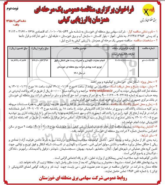 2001001262000001 | انجام عملیات نگهداری و تعمیرات پست های انتقال و فوق توزیع تحت پوشش شرکت برق منطقه ای خوزستان در سال 1401 |