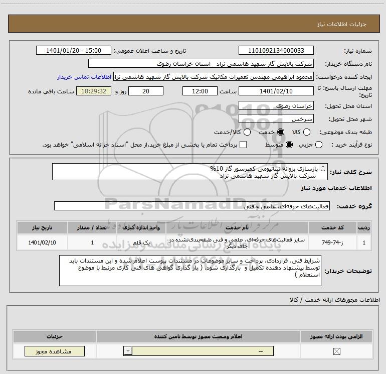 نام دستگاه خریدار:شرکت پالایش گاز شهید هاشمی نژاد استان خراسان رضوی