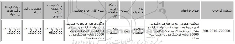 مناقصه، مناقصه عمومی دو مرحله ای واگذاری امور مربوط به مدیریت نصب ،راه اندازی و پشتیبانی ابزارهای پرداخت الکترونیک 30000 پایانه فروشگاهی به مدت سه سال , مناقصه عمومی دو مرحله ای واگذاری امور مربوط به مدیریت نصب ،راه اندازی و پشتیبانی ابزارهای پرداخت الکترونیک 30000 پایانه فروشگاهی به مدت سه سال