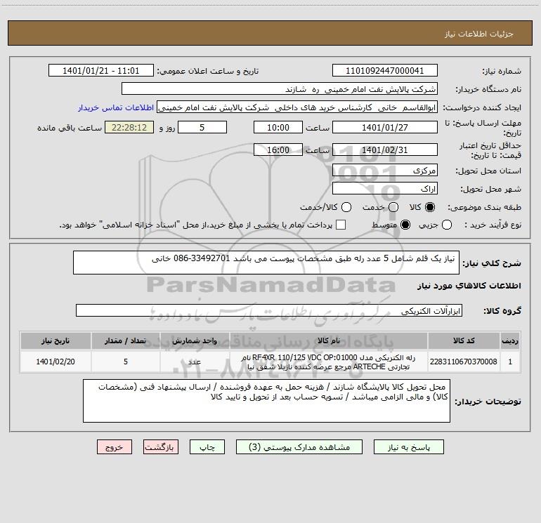 شرح کلی نیاز: نیاز یک قلم شامل 5 عدد رله طبق مشخصات پیوست می باشد 33492701-086 خانی