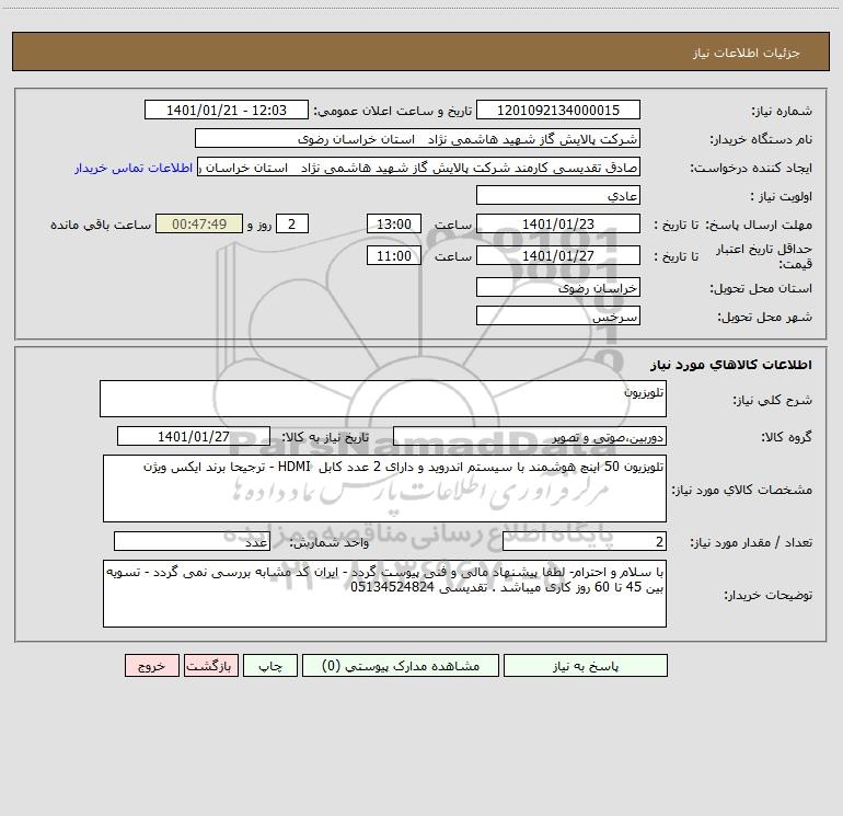 نام دستگاه خریدار:شرکت پالایش گاز شهید هاشمی نژاد استان خراسان رضوی
