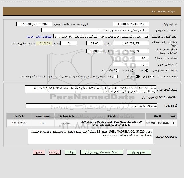 شرح کلی نیاز: روغن SHEL MADRELA OIL GP220 مقدار 12 بشکه/پالت شده وتحویل درپالایشگاه با هزینه فروشنده /ارسال پیشنهاد فنی ومالی الزامی است