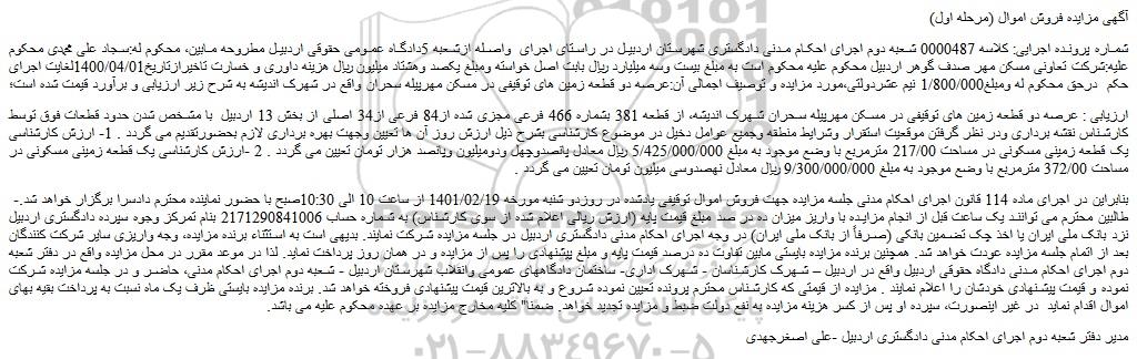 شماره پرونده اجرایی: کلاسه 0000487 شعبه دوم اجرای احکام مدنی دادگستری شهرستان اردبیل در راستای اجرای  واصله ازشعبه 5دادگاه عمومی حقوقی اردبیل مطروحه مابین، محکوم له:سجاد علی محمدی محکوم علیه:شرکت تعاونی مسکن مهر صدف گوهر اردبیل محکوم علیه محکوم است به مبلغ بیست وسه میلیارد ریال بابت اصل خواسته ومبلغ یکصد وهشتاد میلیون ریال هزینه داوری و خسارت تاخیرازتاریخ1400/04/01لغایت اجرای حکم  درحق محکوم له ومبلغ1/800/000 نیم عشردولتی،مورد مزایده و توصیف اجمالی آن:عرصه دو قطعه زمین های توقیفی در مسکن مهرپیله سحران واقع در شهرک اندیشه به شرح زیر ارزیابی و برآورد قیمت شده است؛
