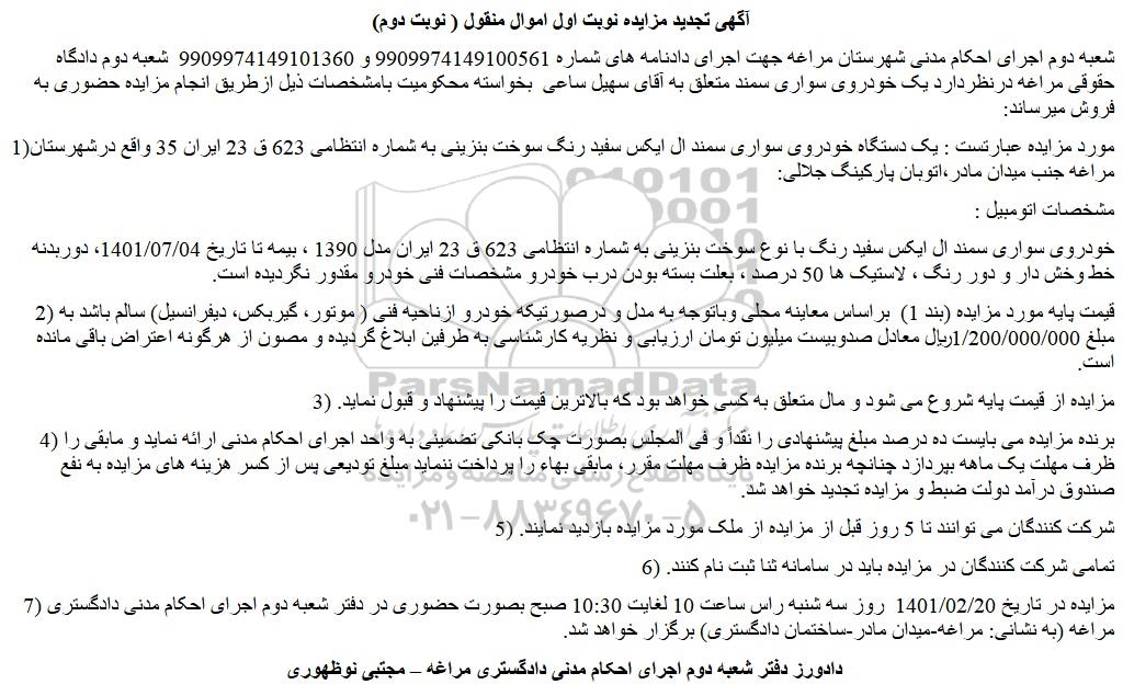 شعبه دوم اجرای احکام مدنی شهرستان مراغه جهت اجرای دادنامه های شماره 9909974149100561 و 9909974149101360  شعبه دوم دادگاه حقوقی مراغه درنظردارد یک خودروی سواری سمند متعلق به آقای سهیل ساعی  بخواسته محکومیت بامشخصات ذیل ازطریق انجام مزایده حضوری به فروش میرساند: